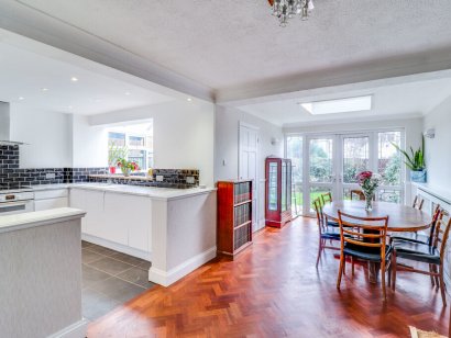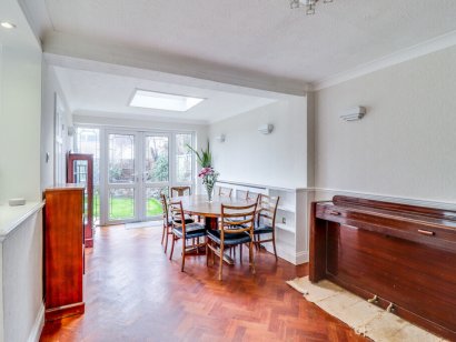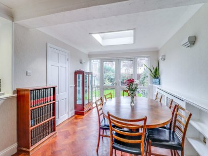 DINING ROOM 19' 7" x 9' 8" (5.97m x 2.95m) Double glazed French style doors leading to and overlooking REAR GARDEN. Double glazed windows to rear aspect. Skylight. Radiator. Parquet flooring. Opening to: