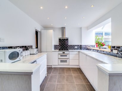 KITCHEN 10' x 9' (3.05m x 2.74m) Skimmed ceiling. Spotlight insets. Range of base and eye level units. Roll edged working surfaces. Inset one and a half sink bowl drainer. Inset 4 ring induction hob with extractor fan above and double electric oven under. Integrated dishwasher. Space for under counter fridge. Tiled splashbacks. Built in larder cupboard. Tiled floor.