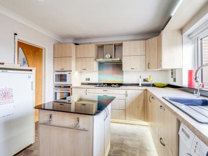 KITCHEN 12' x 10' 7" (3.66m x 3.23m) Skimmed ceiling with spotlight insets. Double glazed window to front aspect. Range of base and eye level units with square edged working surfaces. Inset sink drainer. Inset 4 ring gas hob with extractor fan above. Built in electric oven. Integrated dishwasher. Space for fridge/freezer. Space for washing machine. Space for tumble dryer. Central island with storage beneath. Plinth lighting. Door to: