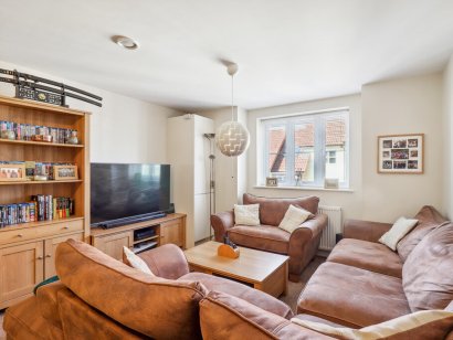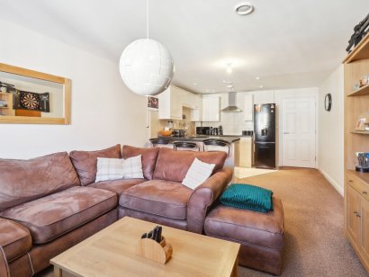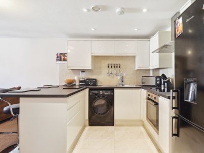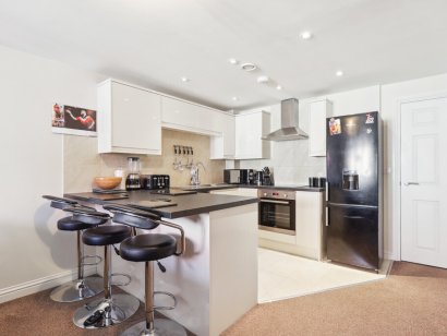 KITCHEN/LOUNGE 23' 2" x 11' 7" (7.06m x 3.53m) Skimmed ceiling with inset spotlights. Double glazed window to side aspect. Range of base and eye level units. Square edge work tops. Stainless steel sink/drainer. Integrated four ring electric hob. Extractor fan above. Integrated electric oven. Space for fridge/freezer and washing machine. Breakfast bar. Tiled splashbacks. Concealed wall mounted boiler. Radiator.