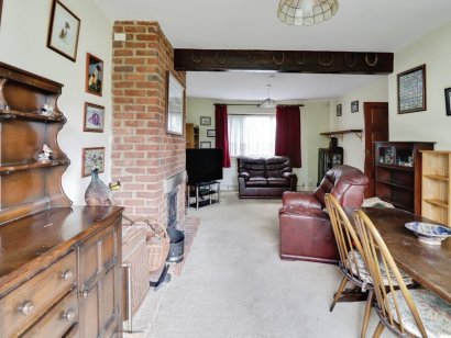 LOUNGE/DINER 24' 1" x 11' 3" max. (7.34m x 3.43m) Double glazed patio doors to rear aspect, providing access to REAR GARDEN. Double glazed window to front aspect. Two radiators. Feature brick built fireplace with wood burner to remain.