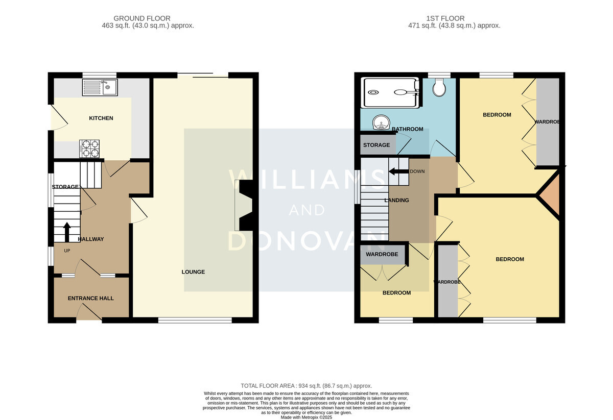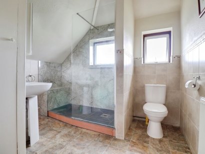 BATHROOM 9' 7" x 7' 6" (2.92m x 2.29m) Two obscure double glazed windows to rear aspect. Three piece suite comprising close coupled w/c, pedestal mounted hand wash basin and double walk in shower cubicle. Built in storage cupboard. Ladder style towel rail. Radiator. Part tiled walls.