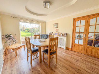DINING ROOM 14' 4" x 10' 5" (4.37m x 3.18m) Double glazed patio doors providing access to rear garden. Radiator. Wood effect flooring. Coving to plastered ceiling.