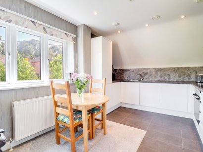 LOUNGE/KITCHEN 22' 10" x 10' 1" max. (6.96m x 3.07m) Skimmed ceiling with spotlight insets. Double glazed windows to front and side aspects. Range of base and eye level units with square edged working surfaces. Inset stainless steel sink drainer. Inset 4 ring induction hob with extractor fan above and electric oven under. Integrated fridge/freezer. Integrated washer/dryer. Two radiators. Part tiled floor. Part carpeted floor.