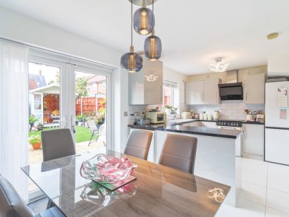 KITCHEN/DINER 17' 8" x 9' (5.38m x 2.74m) Skimmed ceiling. Double glazed window to rear aspect. Double glazed French style doors leading to and overlooking REAR GARDEN. Range of recently fitted base and eye level units with square edged granite effect working surfaces and tiled splashbacks. Inset one and a half bowl sink drainer. Space for cooker with extractor fan above. Space for dishwasher. Space for washing machine. Space for fridge/freezer. Under cupboard lighting. Plinth lighting. Radiator. Tiled wall. Concealed wall mounted boiler.