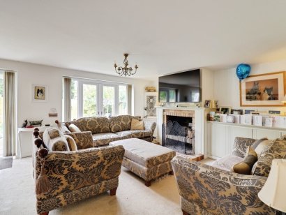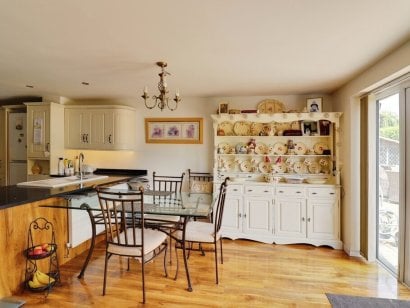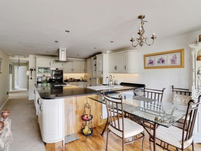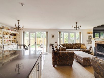 KITCHEN/FAMILY ROOM 25' 3" x 24' 1" reducing to 12' 7" (7.7m x 7.34m > 3.84m) Skimmed ceiling with spotlight insets. Two uPVC double glazed French style doors leading to and overlooking REAR GARDEN. Range of base, eye level and floor to ceiling units with quartz working surfaces and matching upstands. Inset sink drainer with chrome mixer tap. Inset 6 ring range hob with extractor hood over. Built in twin eyeline electric ovens. Further integrated oven. Integrated microwave. Space for fridge/freezer. Space for washing machine. Part tiled laminate wood effect flooring. The LOUNGE area has feature brick built fireplace and laminate wood effect flooring.
