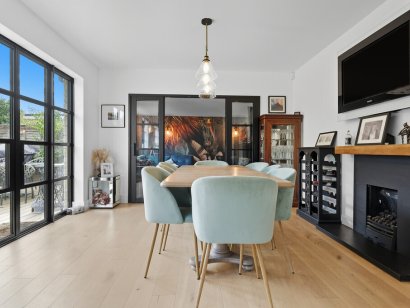 KITCHEN/DINER 29' x 12' (8.84m x 3.66m) Skimmed ceiling with inset spotlights. Double glazed windows to rear aspect. Double glazed aluminium French style doors leading to and overlooking REAR GARDEN. Range of modern base and eye level units with marble working surfaces. Inset sink drainer. Central island with matching working surface. Inset 4 ring induction hob with extractor fan above. Additional single gas hob. Built in double electric ovens. Integrated double fridge/freezer. Feature fireplace. Tall designer radiator. Engineered wood flooring. Double opening doors to: