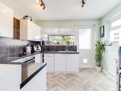 KITCHEN 10' 9" x 9' 1" (3.28m x 2.77m) Skimmed ceiling. Double glazed windows to side and rear aspects. Double glazed door to REAR GARDEN. Range of base and eye level units with roll edged working surfaces and tiled splashbacks. Inset stainless steel sink drainer. Inset 4 ring electric hob with electric oven under. Space for slimline dishwasher. Space for fridge/freezer. Radiator.