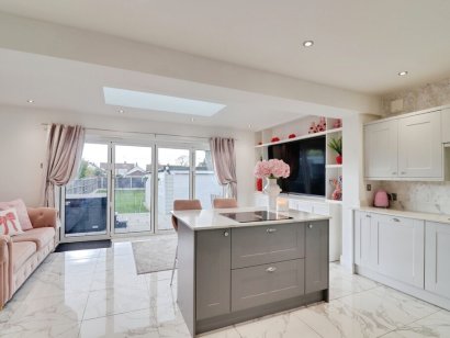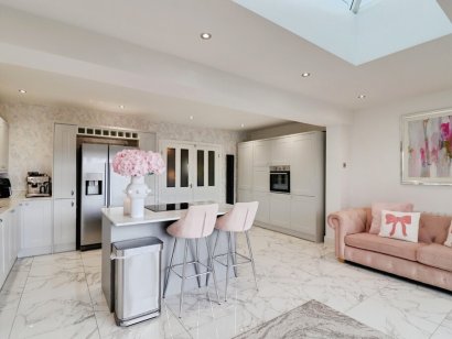 KITCHEN/FAMILY ROOM 18' 7" x 8' 4" (5.66m x 2.54m) Skimmed ceiling with spotlight insets. Double glazed bi-folding doors leading to and overlooking REAR GARDEN. Skylight. Range of base, eye level and floor to ceiling units with quartz working surfaces and matching upstands. Under counter stainless steel one and a half bowl sink with free standing mixer tap. Built in eyeline oven. Integrated dishwasher. Matching island with inset Bosch induction hob. Space for American style fridge/freezer. Radiator. Designer wall radiator. Tiled floor.