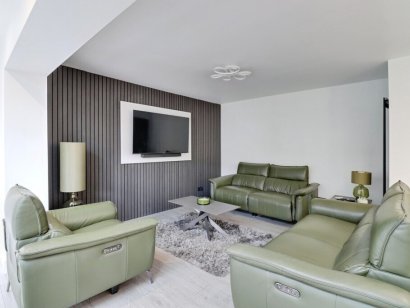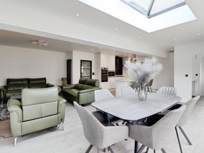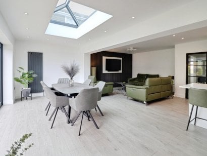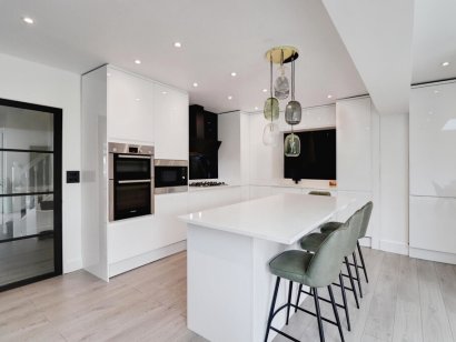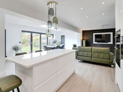 KITCHEN/FAMILY ROOM 27' 7" reducing to 11' 4" x 20' (8.41m > 3.45m x 6.1m) Skimmed ceiling with spotlight insets. Skylight. Bi-folding door providing access to and overlooking REAR GARDEN. Range of base and full length units with quartz working surfaces and glass splashbacks. Inset 5 ring stainless steel gas hob with extractor hood over. Under counter sink with free standing mixer tap. Instant hot water tap. Built in double electric oven. Integrated microwave. Integrated dishwasher. Integrated fridge/freezer. Matching island with breakfast bar and drawers under. Media wall with space for TV. Three radiators. Laminate flooring. Opening to: