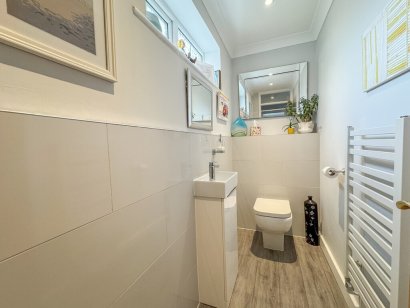 GROUND FLOOR CLOAKROOM/WC Obscure double glazed window to the front aspect. WC with concealed cistern. Inset wash hand basin with high gloss vanity storage below. Wood effect flooring. Part tiled walls. Plastered ceiling. Inset spot lights. Towel radiator.