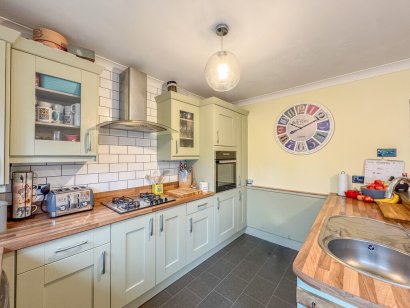 KITCHEN/BREAKFAST ROOM 15' 3" x 11' 3" (4.65m x 3.43m) Double glazed window to the rear aspect. Double glazed patio doors providing access to rear garden. Comprehensive range of Shaker style base and eye level units. Wood effect roll edge work surfaces. Circular inset stainless steel sink drainer unit. Eye level electric oven. Separate gas hob with stainless steel extractor chimney above. Brick shape tiled splash back. Space for appliances. Solid wood flooring. Coving to ceiling. Radiator.