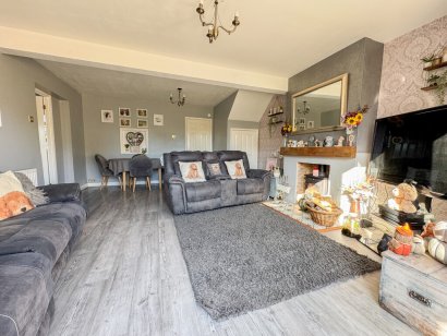 LOUNGE 18' 1" x 14' 9" (5.51m x 4.5m) Double glazed French doors providing access to rear garden. Full height storage cupboard. Feature fireplace with oak mantle and inset log burner. Radiators. Wood effect flooring. Plastered ceiling. Door to bedroom four/sitting room.
