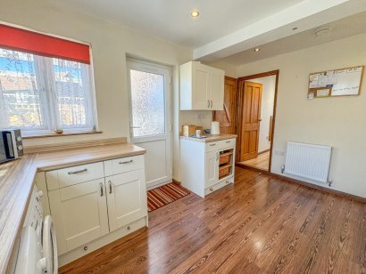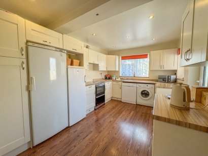 KITCHEN 13' 7" x 10' 3" (4.14m x 3.12m) Double glazed window to rear aspect. Double glazed door providing access to rear garden. A comprehensive range Shaker style base and eye level units incorporating roll top wood effect work surface with inset stainless steel sink drainer unit. Space for freestanding cooker with extractor above. Space and plumbing for washing machine and dishwasher. Housing for American style fridge freezer. Wood effect flooring. Plastered ceiling with inset LED spotlighting. Door to reception room.