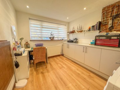 RECEPTION ROOM 14' 4" x 10' 3" (4.37m x 3.12m) Double glazed window to front aspect. Base level units. Radiator. Wood effect flooring. Plastered ceiling with inset LED spotlighting. Door to ground floor wc.