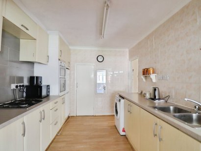 KITCHEN 10' 6" x 9' 2" (3.2m x 2.79m) Range of base and eye level units with roll edged working surfaces and tiled splashbacks. Inset sink with chrome mixer tap. Inset 4 ring gas hob. Built in twin eyeline electric ovens. Space for fridge/freezer. Space for washing machine. Pantry cupboard under stairs. Laminate wood effect flooring. Open plan to: