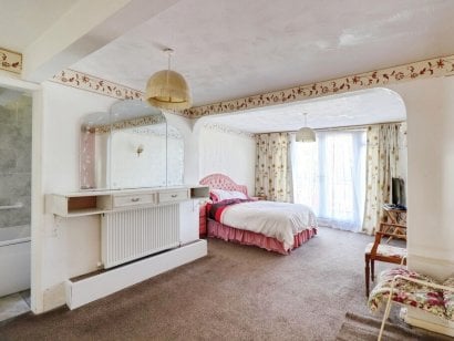 BEDROOM ONE 19' 8" x 13' reducing to 10' 5" (5.99m x 3.96m > 3.18m) UPVC double glazed patio doors to BALCONY at rear. Radiator. Door to:
