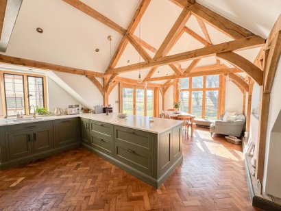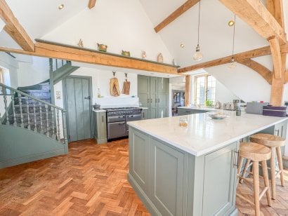 LUXURY FITTED KITCHEN/BREAKFAST ROOM 25' 8" x 17' 4" (7.82m x 5.28m) A stunning feature plastered vaulted ceiling with inset spotlighting and feature oak truss and beams. Stunning custom full height glazed window to rear aspect. Bi-folding glazed doors providing access to rear garden. A luxury custom fitted kitchen by KDB Kitchen Designs incorporating solid wood Shaker style base and eye level units incorporating marble effect quartz worksurface with inset sink drainer and hot tap. Integrated appliances. Freestanding Range cooker with built in extractor. Integrated fridge freezer. Pull out larder cupboard. Full height under stairs storage cupboard. Continuation of solid Oak herringbone flooring. Stairs providing access to first floor.