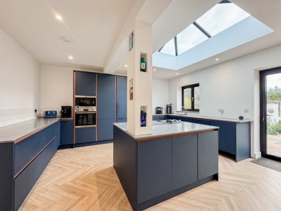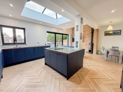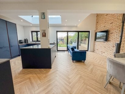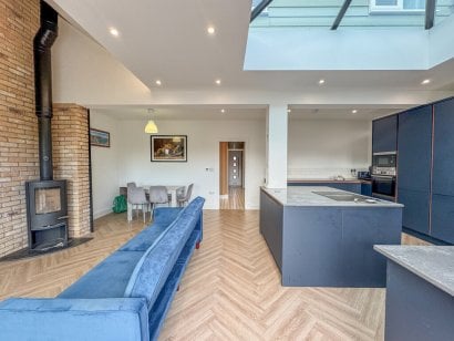 STUNNING KITCHEN/FAMILY ROOM 24' 7" x 16' 7" (7.49m x 5.05m) Double glazed window to the rear aspect. Double glazed bi-fold doors providing access to rear garden. Double glazed roof lantern. Comprehensive modern range of luxury base and eye level units. Quartz work surfaces. Inset sink drainer. Brick shape tiled splash backs. Integrated eye level oven. Integrated microwave. Island incorporating Induction hob. Integrated washing machine. Integrated dish washer. Integrated fridge/freezer. Wood effect Karndean Herringbone flooring. Feature brick 'Slip tiled' wall with Log Burner. Part vaulted plastered ceiling. Inset spot lights. Under floor heating.