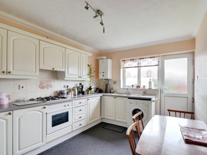 KITCHEN 13' 2" x 9' 9" (4.01m x 2.97m) uPVC window to rear aspect and uPVC door to rear giving access to rear garden, wall and base level units with tiled splashbacks, inset stainless steel sink and a half, integrated 4 ring gas hob with extractor hood over and electric oven under, space for washing machine and fridge freezer, radiator.