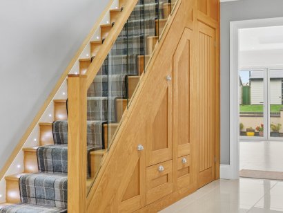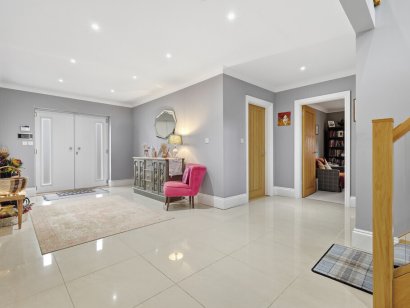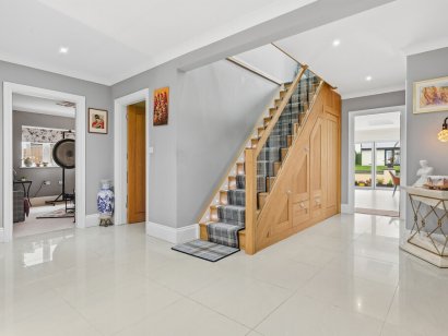 ENTRANCE HALL Spacious entrance hall comprising skimmed ceiling with inset spotlights. Solid oak staircase with glass balustrades, led lighting and understairs storage. Security alarm system. Tiled floor with underfloor heating. Doors to: