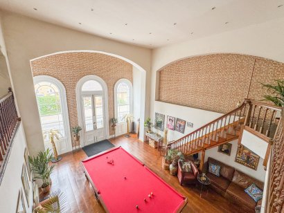 Windows and double doors to front aspect. Currently be used as a snooker room. Feature vaulted ceiling measuring 19' 10" (6.05m). Double doors to office/workshop. Double doors to further inner hallway. Stairs to stunning MEZZININE FLOOR with balustrade and exposed brickwork walls providing a viewing gallery type space overlooking the spa room.
