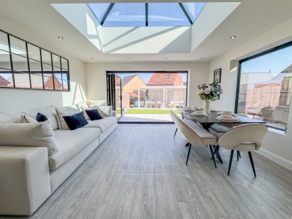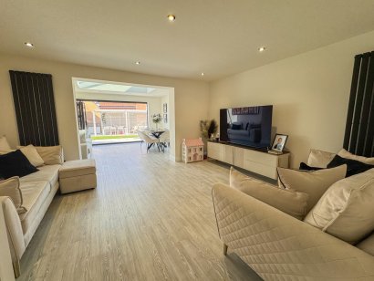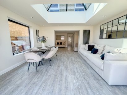 Feature Box Square window to the side aspect. Double glazed bi-fold doors providing access to the landscaped rear garden. Large glass roof lantern. Wood effect flooring. Plastered ceiling. Inset spot lights.