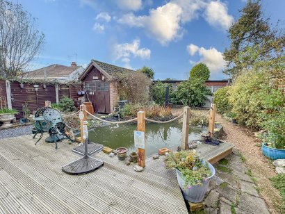 A LANDSCAPED REAR GARDEN commencing with raised decked area with wooden posts and rope balustrade and ornamental feature pond. Low maintenance shingle to the remainder of the garden. A selection of mature shrubs to borders. DETACHED PITCHED ROOF GARAGE with double opening doors. Power and lighting.