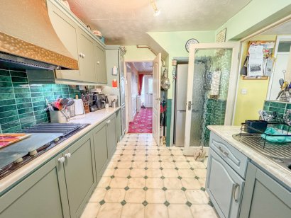 A range of base and eye level units incorporating roll edge work surface with inset sink drainer unit. Integrated twin eye level gas oven. Hob with extractor above. Tiled effect flooring. Door to utility room.