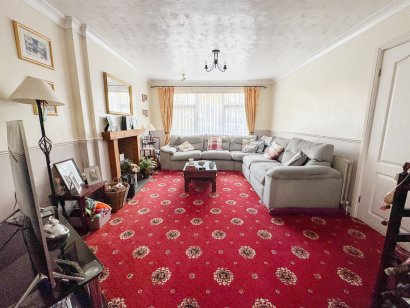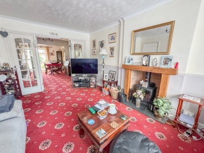 Double glazed window to front aspect. Feature fireplace with inset log burner. Radiator. Coving to textured ceiling. French doors providing access to dining room.